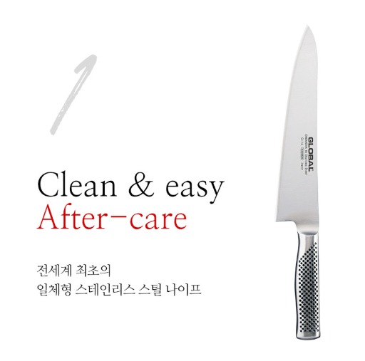 전세계 최초의 일체형 스테인리스 스틸 나이프, 용도 따라 다른 인체공학적 손잡이 형태, 칼날 경사면 12-15도의 탁월한 절삭력을 자랑하는 양면날 형태가 글로벌나이프의 강점이다.