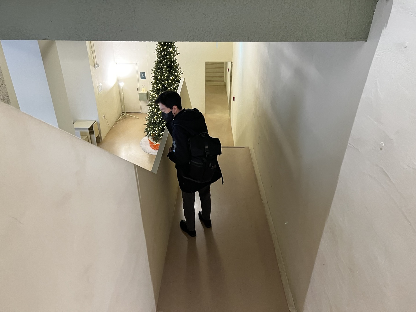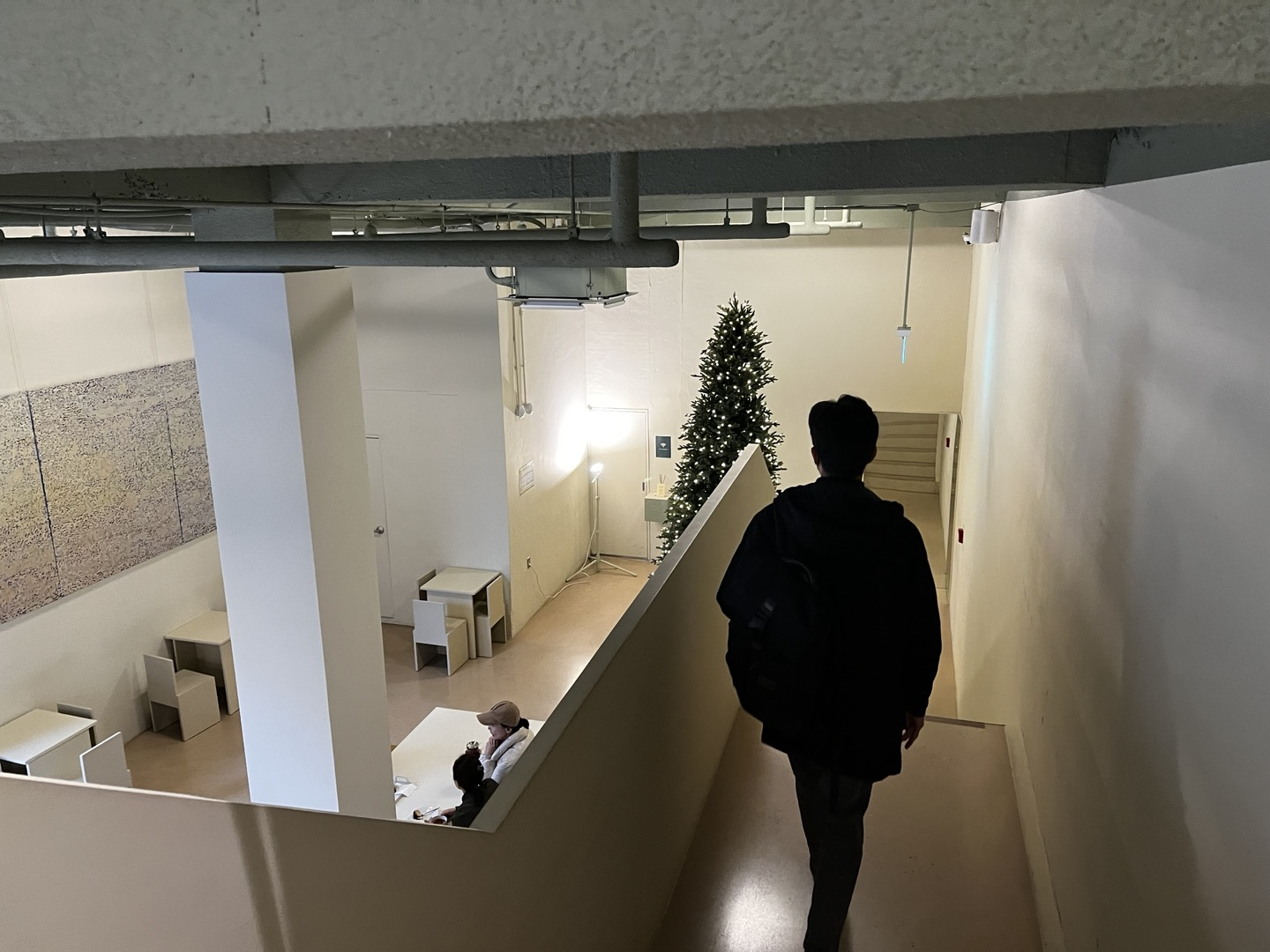 내려가며 보니 대형 트리가 보였다. 따뜻한 색의 조명과 큰 트리. 그리고 남편. 그리고 평일 낮시간. (그리고 스콘) 행복하지 않을 수가.