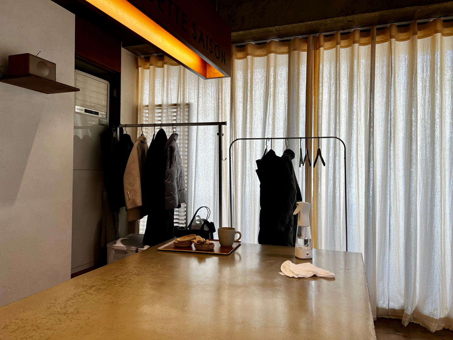 자리는 큰 바에 둘러앉을 수 있는 규모였다. 의자가 7개정도 있었던 것 같았다. 단체손님이 안쪽에 5명이 있었고, 우리가 남아있는 의자를 입구쪽으로 가져와 앉았다. 오른편으로는 옷걸이가 있어 소지품을 보관할 수 있고, 뒤편으로는 바로 출입문이다.
