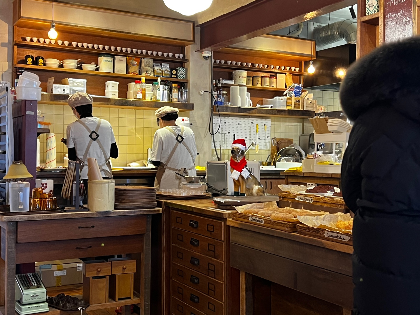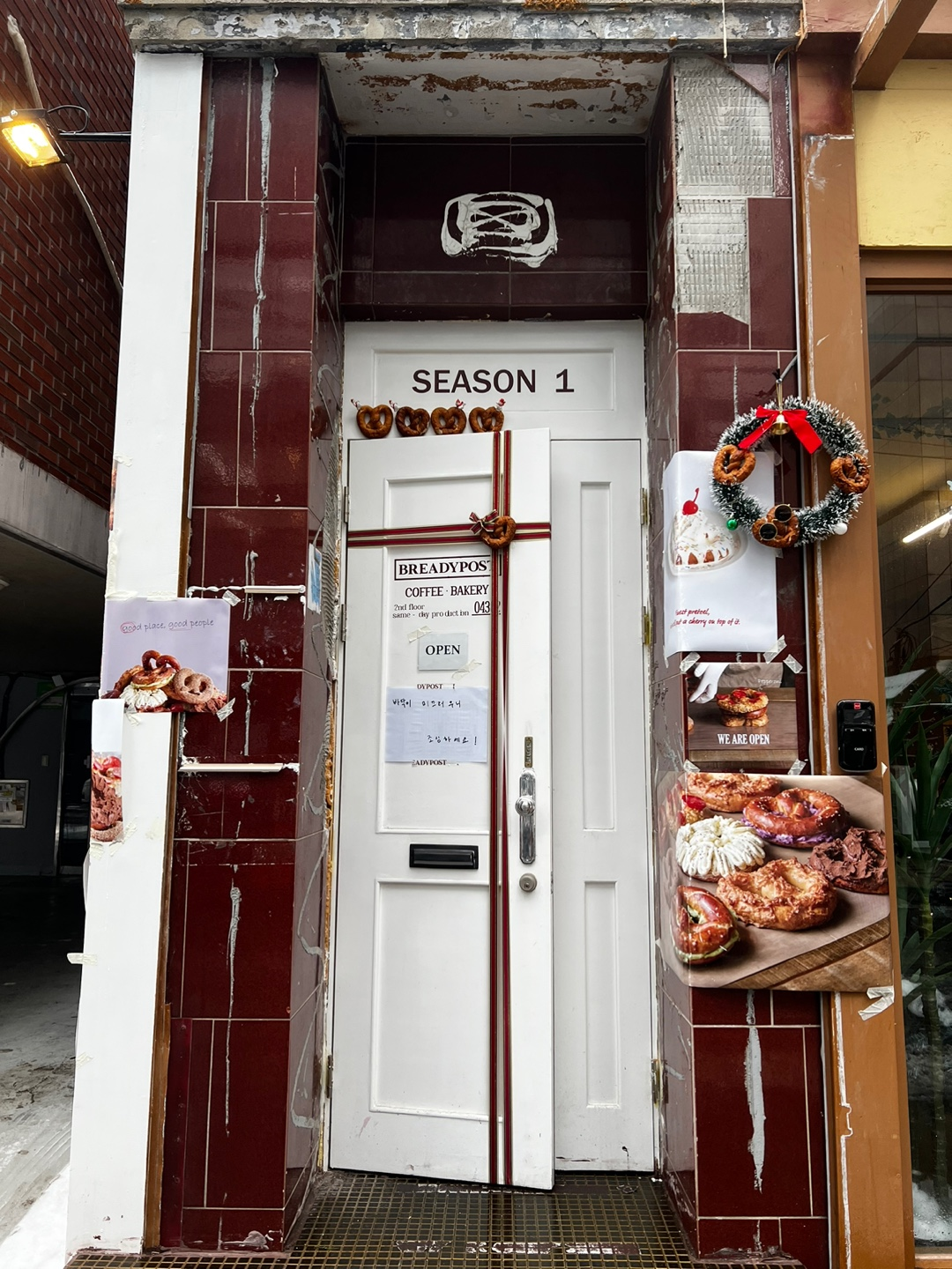 프레즐을 고르고 오른편 안쪽으로 들어가면 앉을 수 있는 공간과 카운터가 있다. 전체적으로 추운 겨울과 어울리는, 연말의 무드와 따스함이 있다. 붉은 컬러와 우드 소재에서 오는 따스함.