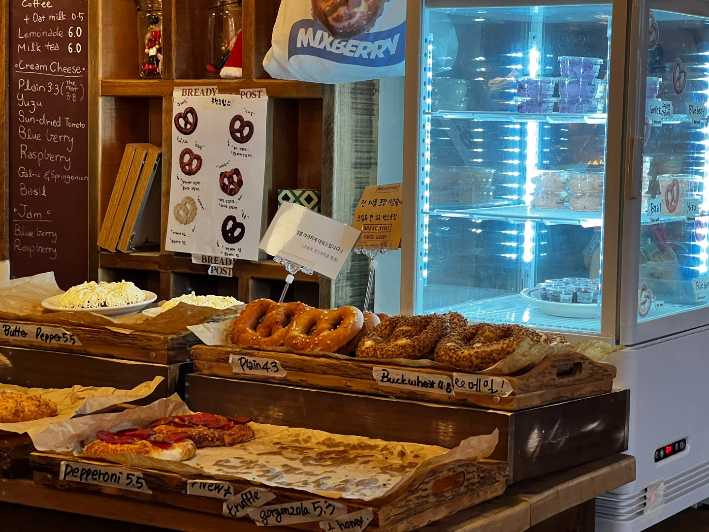 진열되어있는 프레즐,, 사실 브레디포스트에 도착하기 전에 여행을 떠나면서 차안에서 먹을 프레즐을 미리 골랐었다. 미리 고르고 갔는데 실제로 보고도 나의 선택에는 변함이 없었다!!